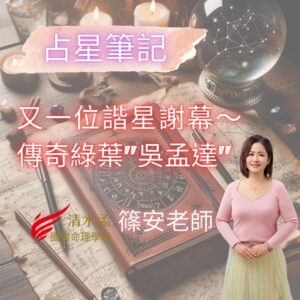 占星筆記 占星筆記 「藝人的感情試煉~三王星之戀」 篠安老師 2019/10/10 占星筆記 「藝 Read More » 占星筆記-老頑童謝幕–志村健 篠安老師 2020.3.20 「占星筆記」老頑 Read More » 占星筆記–『漫談這次奇妙的水星天蠍逆行』 篠安老師 2019/10/31 占星筆記 Read More » 「占星筆記」 冥王星人的虐戀 篠安老師 2021/10「占星筆記」 冥王星人 Read More » 『占星筆記』~如夢似幻的海王星,是幻滅還是救贖? 篠安老師 2020/11/12『占星筆記』~如 Read More » 『占星筆記』又一位諧星謝幕~傳奇綠葉”吳孟達” 篠安老師 2021/2/27『占星筆記』又一位 Read More » 占星筆記-淺談上升星座與日月相位 篠安老師 2020/11/21『占星筆記』淺談 Read More » 戀愛占星術-三王星之戀~冥王星之戀 篠安老師 2020/6/26『戀愛占星術』 三 Read More » 『占星筆記』—壞行運,帶來隱藏的禮物 篠安老師 2019/11/6『占星筆記』 Read More » 『占星筆記』成長的代價 篠安老師 2020/6/11 『占星筆記』成長 Read More » 占星筆記-前世的軌跡 篠安老師 2020.6.3『占星筆記』前世的軌 Read More » 占星筆記-金冥刑,用生命去証明的情感 篠安老師 2020.11.20『占星筆記』金冥 Read More »